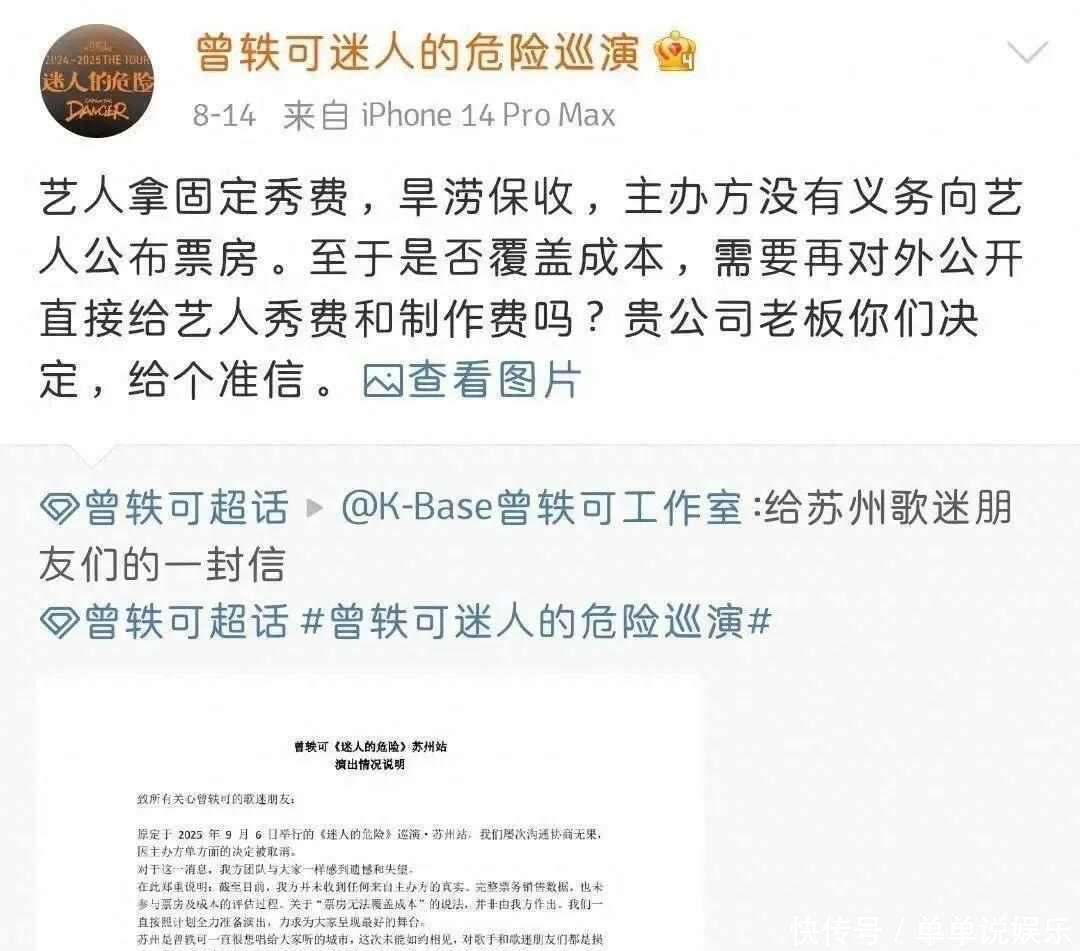 其实这也不是曾轶可第一次碰上票房的麻烦,2022年她办“接触”巡演的时候,好多地方都闹过票务问题,她从快乐女声出来的,大家叫她氧气系歌手,现在她得在赚钱和做自己之间来回折腾,这几年她一直埋头写歌,2023年出了张专辑叫《迷人的危险》,乐评人说不错,可卖得并不怎么样。这次取消公告是杭州葫芦狗文化发的,他们就是苏州站的主办方,听说俩家合作时因为分成闹了矛盾,票房没达到预期,主办方就直接撤了,没想着怎么补救,不少歌迷觉得这事儿办得不地道,微博上#曾轶可演唱会取消#这个话题,一夜之间看了两亿多次。